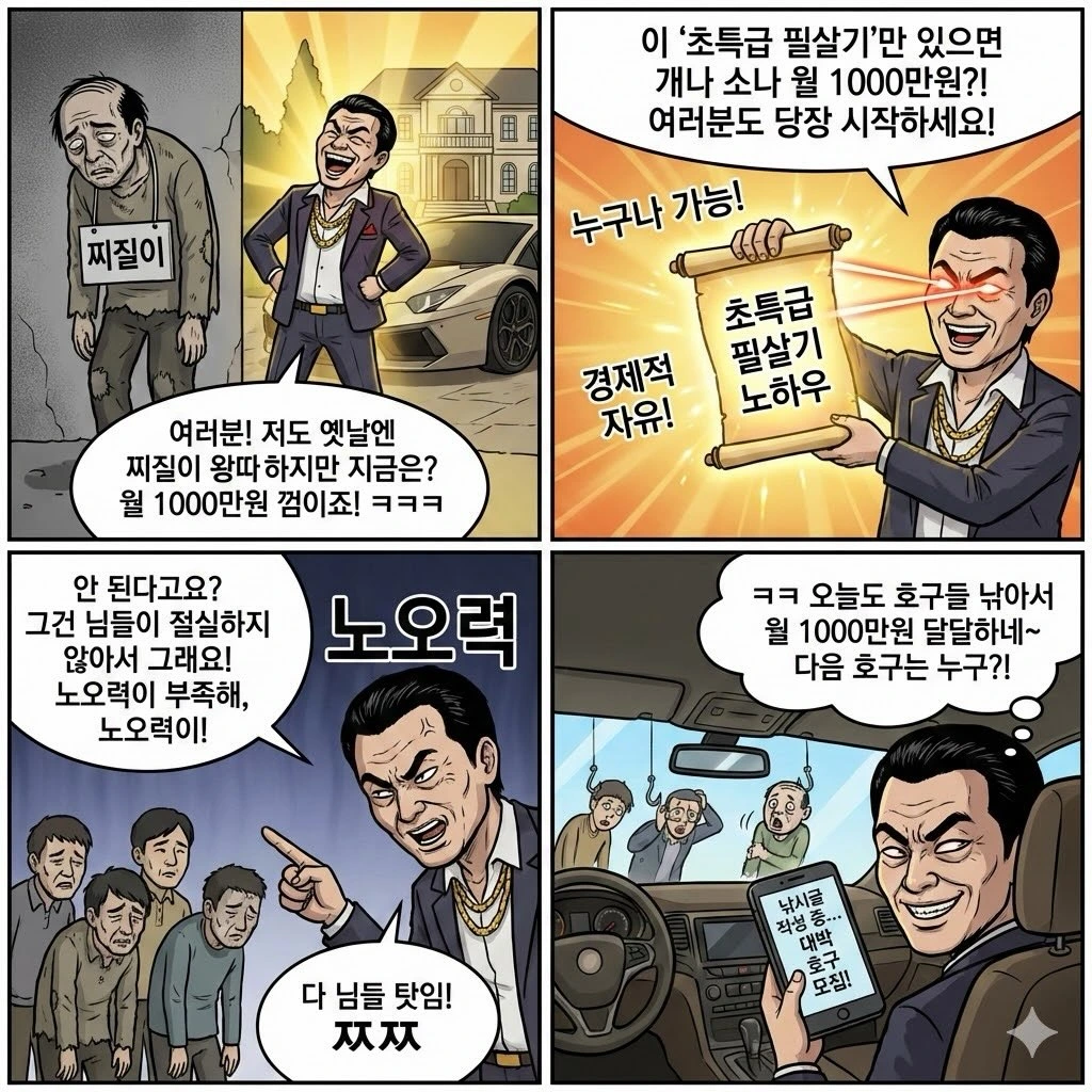 1. ‘간절함’을 낚는 약탈적 마케팅의 실체 많은 ‘가짜 전문가’들이 대중의 경제적 어려움과 성공에 대한 간절함을 미끼로 사용합니다. 만화에서 보여주듯, 그들은 이성적인 판단보다는 감정을 자극하여 “나도 저 사람처럼 될 수 있다”는…