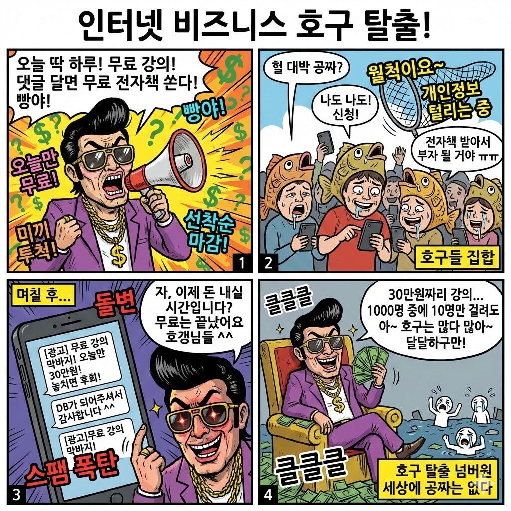 1. ‘간절함’을 낚는 약탈적 마케팅의 실체 많은 ‘가짜 전문가’들이 대중의 경제적 어려움과 성공에 대한 간절함을 미끼로 사용합니다. 만화에서 보여주듯, 그들은 이성적인 판단보다는 감정을 자극하여 “나도 저 사람처럼 될 수 있다”는 환상을 심어주고, 고가의 강의나 전자책 결제를 유도하는 약탈적 구조를 가지고 있습니다. 2. ‘성공 팔이’의 비즈니스 모델: 수익은 당신의 지갑에서 나온다 만화의 반전(4컷)처럼, 그들이 과시하는 부(슈퍼카, […]